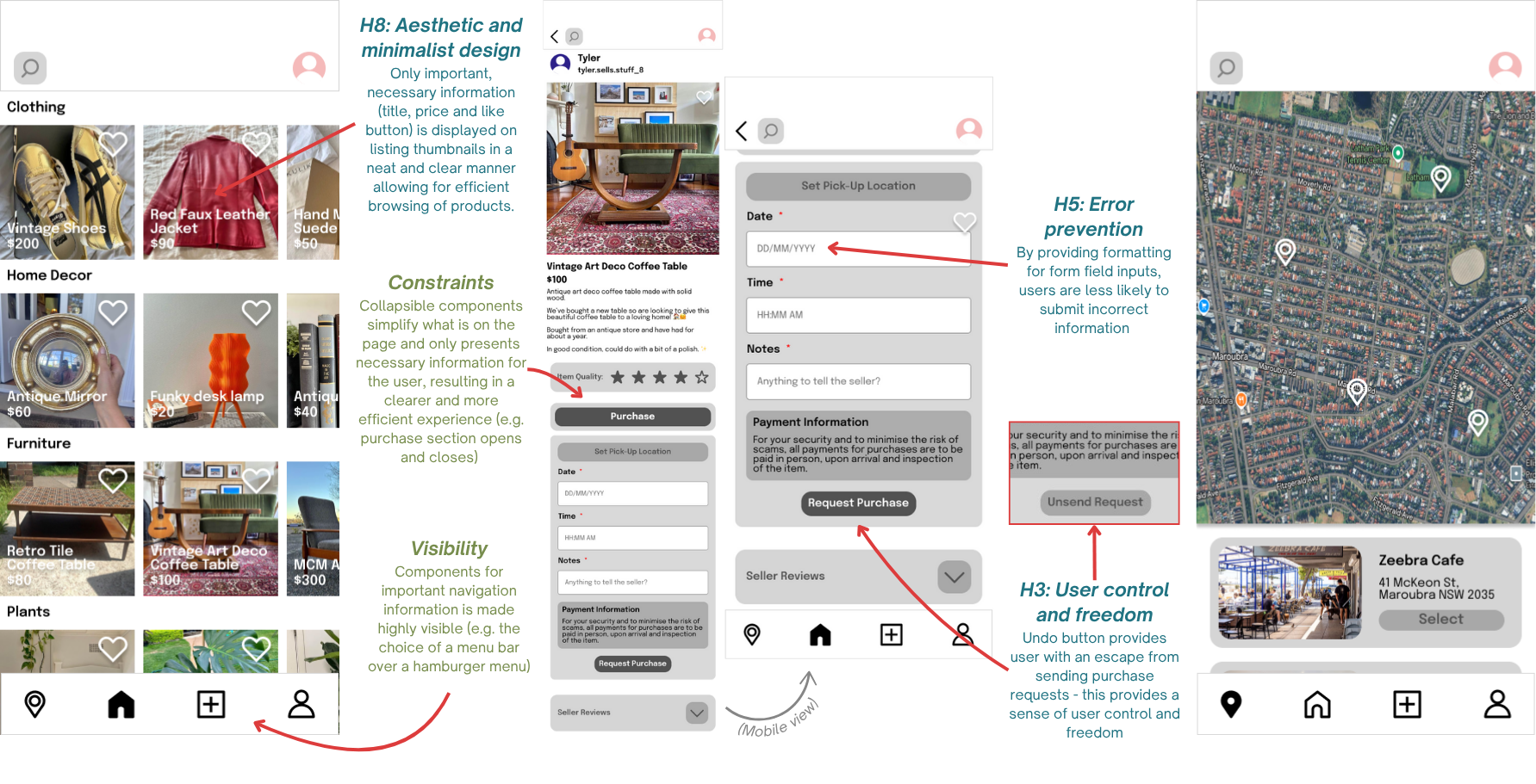 Design principles are annotated in green and Neilsen’s Usability Heuristics are annotated in blue.