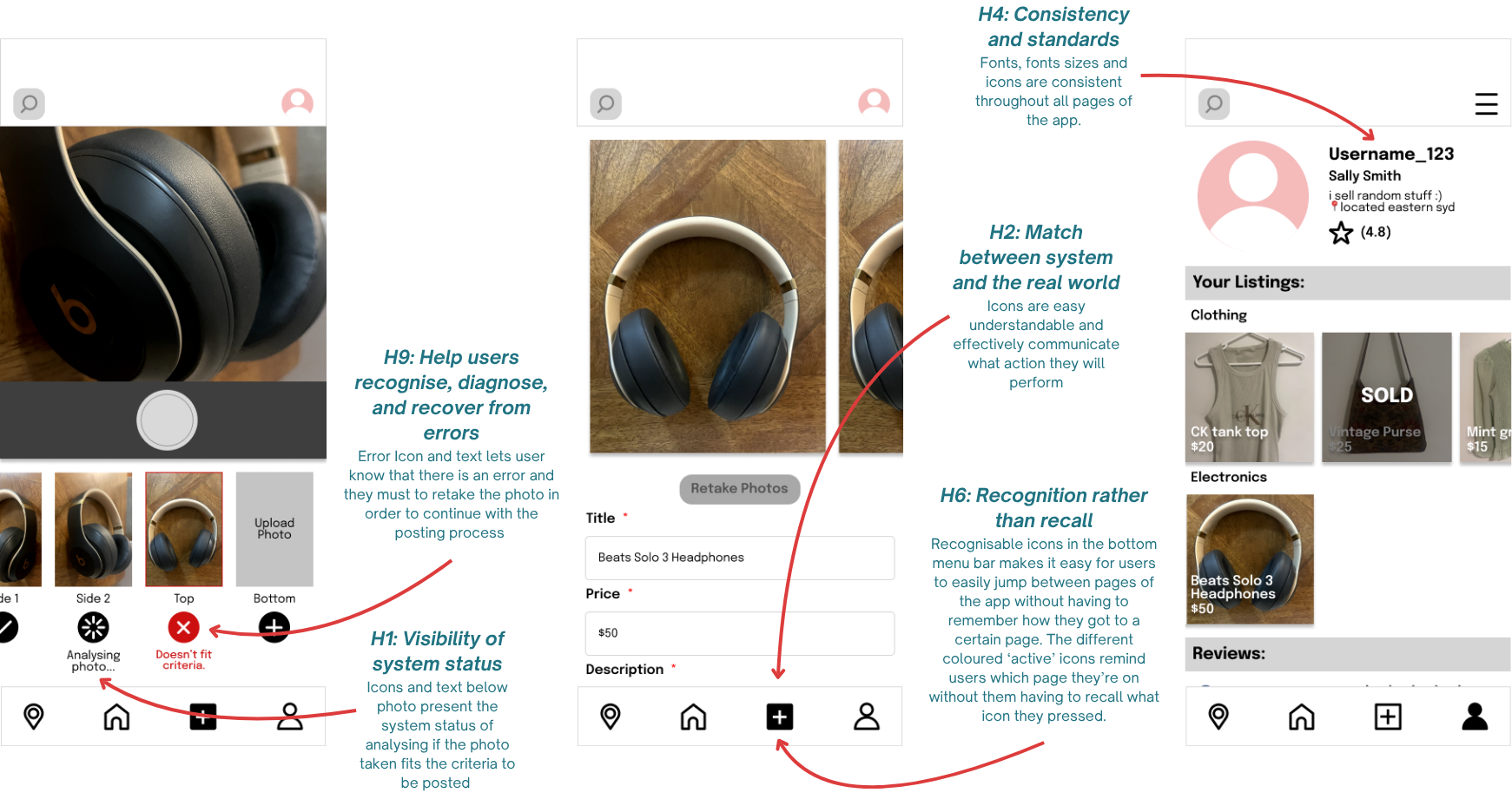 The methodology for usability evaluation included user testing, through the think-aloud method, post-test interviews, and System-Usability-Survey (SUS) Questionnaires - and heuristic evaluation. The overall objectives for the usability evaluation were: users can easily navigate through the app with no difficulty, users can efficiently find the product they are looking for, users can successfully assess the quality and price of the product, users feel a sense of safety in their experience. 4 participants of varied experiences and skill in using online C2C marketplaces were tested. The participants also had varied ages, socioeconomic backgrounds and technological skill levels. The testing was performed in person. The equipment used was an iPhone for the LOFI prototype, iPad with Microsoft Word’s ‘text-to-speech’ feature enabled to transcribe the tests, the usability test observation form and the Interaction Design Foundation SUS template.